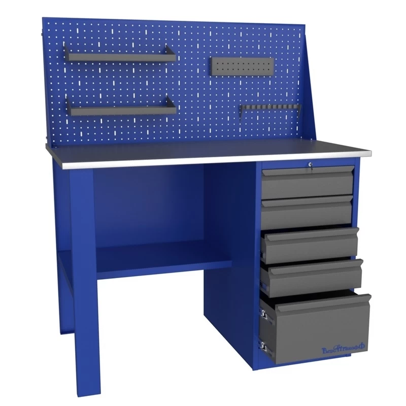 - Предлагается большой выбор моделей и возможность собрать верстак под индивидуальные потребности – из однотумбовых и двухтумбовых столов, тумб пяти видов, перфорированных экранов, шкафов и так далее.